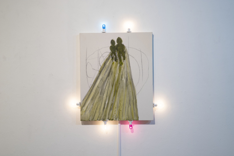 - キャンバス・アクリル絵具・木炭、電球