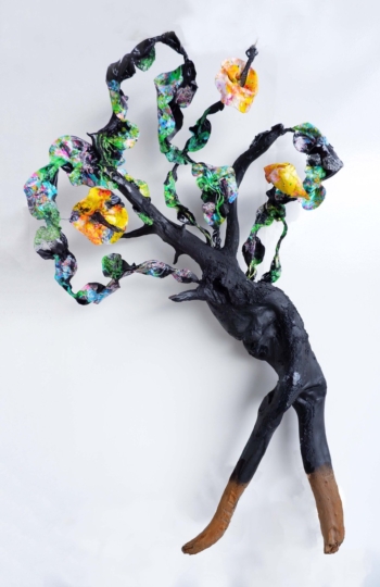 - Driftwood, resin clay, acrylic paint, medium, paper, wire