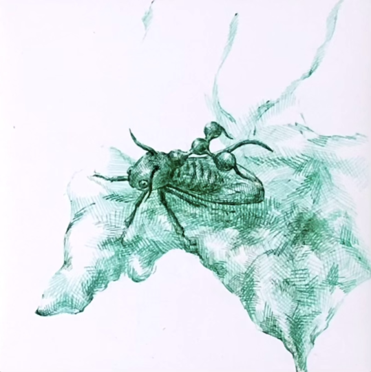 pen on paper mounted on wood panel